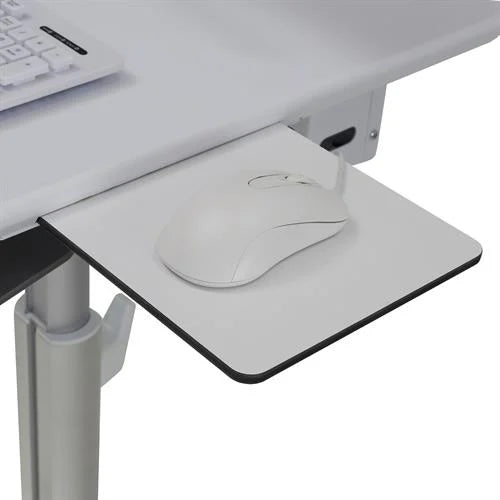 Pull-Out Mouse Shelf Extends left or right; surface 7.5" × 7.5" (19 × 19 cm); stows under worksurface when not in use