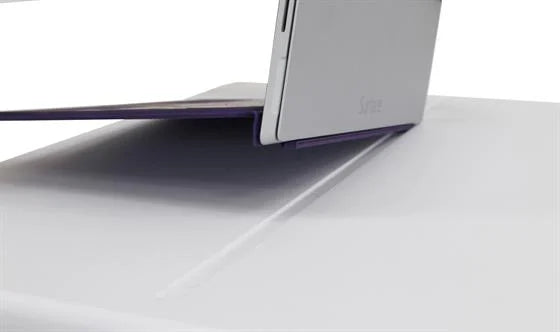The worksurface is specially designed with embedded magnets to hold a Surface tablet securely in three positions—left, right, or centre—while still offering ample space for a mouse or other task-related items. A hidden yet accessible storage compartment accommodates a power brick or AC adapter, keeping cords out of sight while maintaining easy access.
