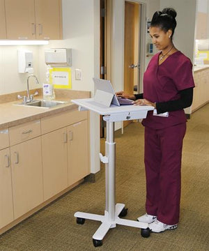 With 15 inches (38 cm) of vertical height adjustment, the cart supports both seated and standing workflows, ensuring ergonomic comfort for users of varying heights. The integrated hand-brake locks the platform securely in place, providing a stable, reliable work surface for tablet interaction, documentation, or charting.