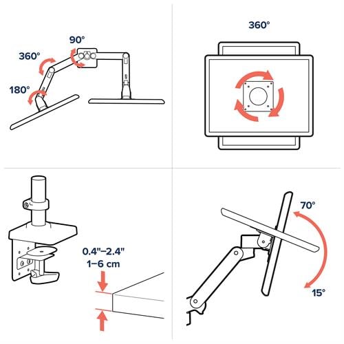 Installation has never been simpler. With fewer parts and intuitive adjustment mechanisms, setup is quick, straightforward, and frustration-free. Once mounted, the LX Pro raises your screen off the desk, freeing valuable workspace while enhancing comfort and productivity.
