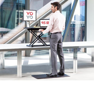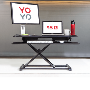 Yo-Yo Desk 95-s glides effortlessly up/down to 30 adjustable heights using a unique Quick-Release lock. The Yo-Yo Desk 95-s Standing Desk Converter is 95cm wide and suitable for DUAL monitor workstations or smaller desks. Key Features